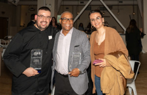 Former Ald. Walter Burnett Jr. (center) with Nestor Hurtado (left) and Laura Villegas (right) of Brothers Restaurant, NBW's Small Business of the Year Award winner